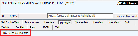 If the request to api.ipify.org is unsuccessful, the IP address will be the machine's RFC1918 address instead of a public IP. The C2 server replies with an instruction to download a file (highlighted in red above) and the download is initiated immediately. The beacon information, with the exception of the IP address, is also stored in the registry: