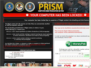 The other malware is interesting. The attacker uses the recent news about PRISM to claim that the victim's computer has been blocked because it accessed illegal pornographic content. The victim has to pay $300 through MoneyPak, a prepaid card service.